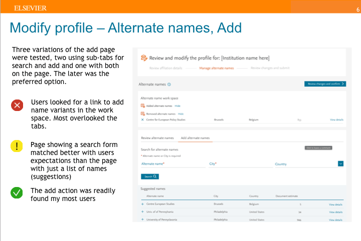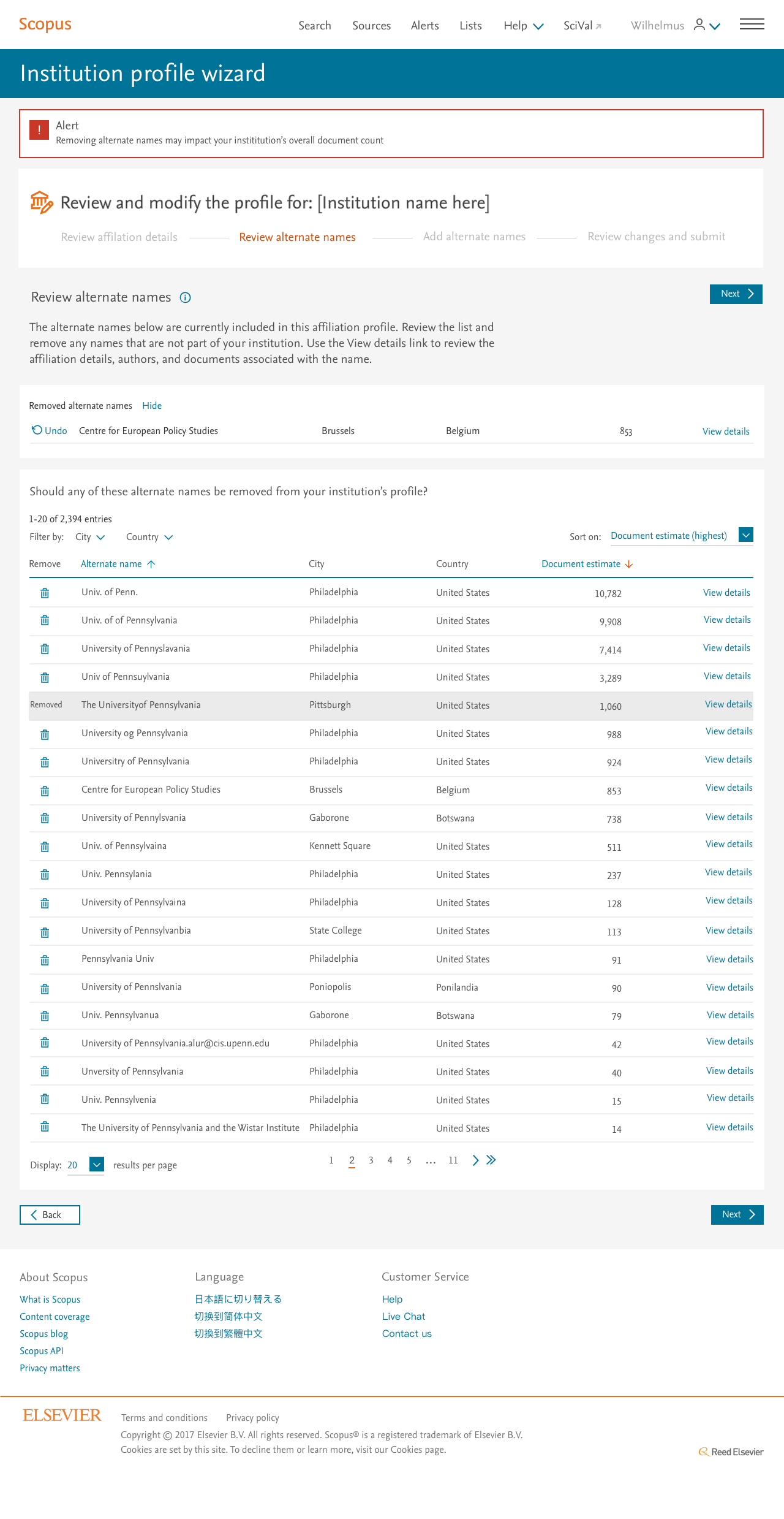 I was the UX lead for this investment project to build a tool that would allow users to update the data for their Scopus institution profiles. I joined this special project from almost the very beginning and was dedicated to work on it for the initial concept phase through two development phases. I worked very closely with the development lead and product manager (there were 3 PMs over the course of the whole project). In terms of data and design this was the most complex project I have ever worked on, but the tool was delivered on time and on budget.